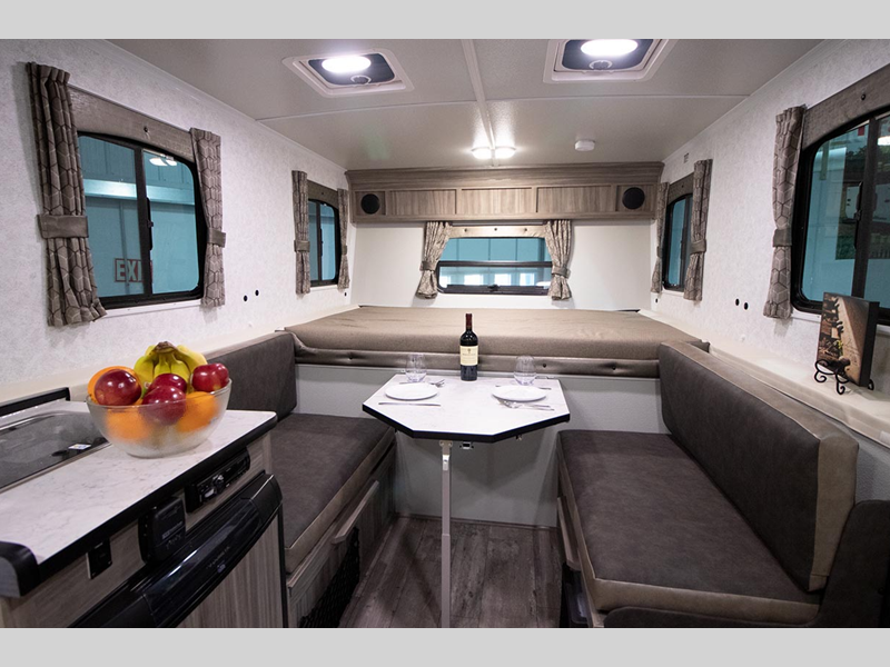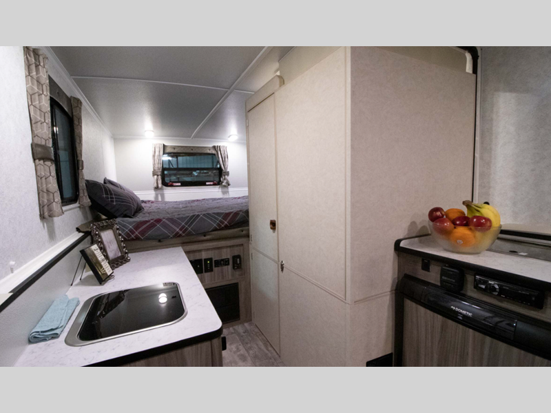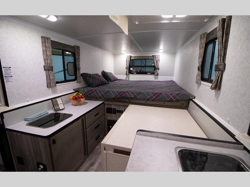 Inside, you'll enjoy your own two burner stove and refrigerator so you're not always cooking on the firepit outside, plus there is dry bath so you don't have to use the camp's facilities. Each model includes durable construction materials, including a metal underbelly, a 3" laminated floor, and a 2" x 5" steel frame. The rubber torsion axles with independent suspension will provide smooth towing, and the outside shower will come in handy when cleaning off your hiking boots.